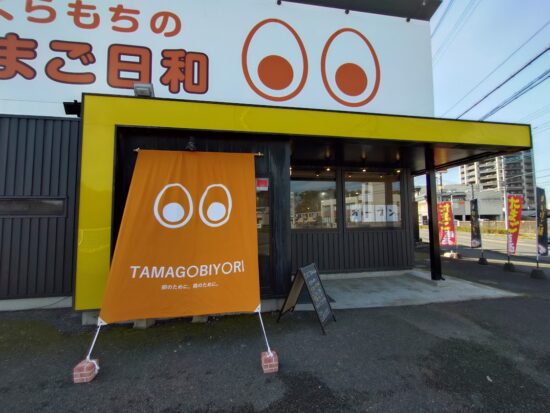 かわいいたまごのイラストと「たまご日和」の大きな看板が印象的です。